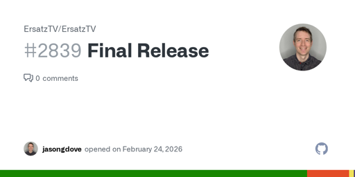 arrow-up190arrow-down1external-linkJust an FYI, but ErsatzTV is no longer maintained if you use it.plus-squaregithub.comosanna@lemmy.vg to Selfhosted@lemmy.worldEnglish · 1 day agomessage-square15linkfedilink