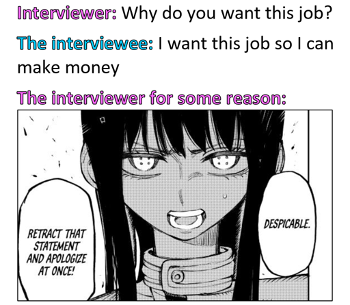 Ill be honest, I answer that way because I need to know if they’re going to communicate with me like a normal person, if you can’t respond positively to that answer or at least laugh it off and redirect, then I 100% can’t trust you to pull off the manager face every now and then and talk to me civilly about things /be understanding and not uphold policies that make no sense.