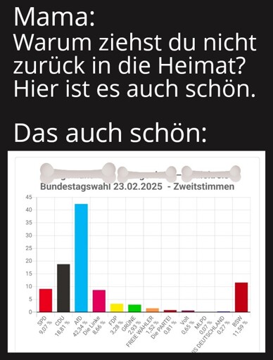 Nur bei uns hat fast keiner Grüne oder Linke gewählt. War so ziemlich 44% AfD, 40% SPD, 3% Grüne, 1% Linke und der Rest BSW. Keiner hat hier im Dorf CDU gewählt.