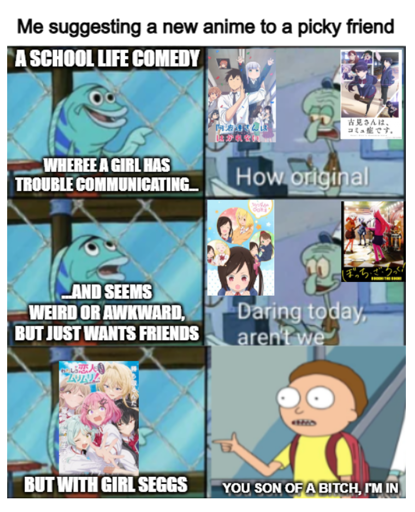 minus-squareremon@ani.sociallinkfedilinkEnglisharrow-up17·5 months ago Aharen-san wa Hakarenai (top left) Komi Can’t Communicate (top right) Hitori Bocchi no Marumaru Seikatsu (middle left) Bocchi the Rock! (middle right)