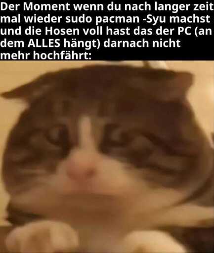 Und genau aus diesem Grund verwende ich kein Arch. Beim Update Angst haben zu müssen dass das den PC killt kenne ich von Ubuntu, Mint und auch Fedora einfach nicht. Mag sein dass die Memes übertrieben sind, aber selbst wenn die Chance nur 5% so hoch wie der Ruf ist ist es mir trotzdem noch zu hoch. Habt natürlich trotzdem gerne euern Spaß mit arch, ihr habt dafür das Recht / Pflicht es jedem mitzuteilen…