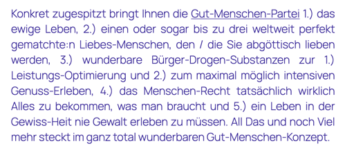 Zur 1.) besseren Lesbar-Keit und 2.) zur Förderung der Klar-Heit in der deutschen Sprache soll es zudem eine Mini-Modern-Isierungs-Recht-Schreib-Reform geben, so dass verschiedene Sinn-Ein-Heiten in Substantiven durch Binde-Strich getrennt werden sollen. Bei Adjektiven sollen zusätzlich lateinische Präfix-Vor-Silben wie etwa „inter-“ – lateinisch für „zwischen“ – mit Binde-Strich abgetrennt werden. Zum Bei-Spiel: „Inter-subjektive Nach-Voll-Zieh-Bar-Keit“. Gleiches gilt für das Gegen-Teil bedeutende Präfix-Vor-Silben wie „un-“ oder auch „a-“ – und auch generell können längere Adjektive leichter lesbar gemacht werden durch Ab-Trennen von Sinn-Ein-Heiten mit einem Binde-Strich – wie bei den Substantiven. Ferner gendert man Im gesprochenen Deutsch nicht – dafür gendert man dann aber im geschriebenen Deutsch – nur bei Sprich-Wörtern gendert man auch im geschriebenen Deutsch nicht, um die 1.) Schön-Heit und 2.) In-Takt-Heit des Sprich-Wortes nicht zu ruinieren.