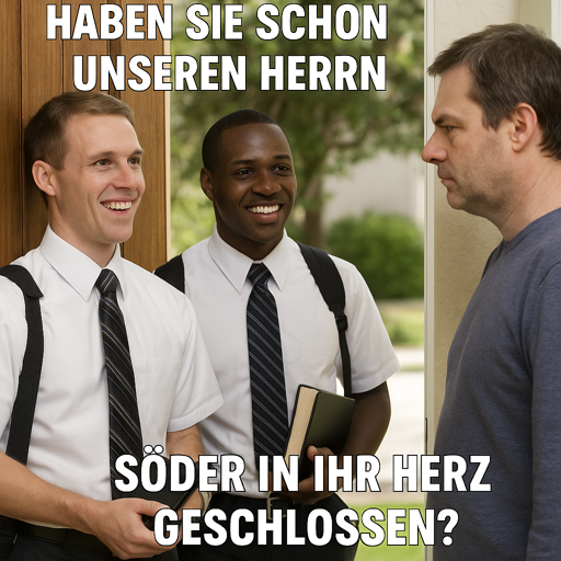 Würde auch sagen. Die Haare bei dem ganz links, der Rucksackriemen bei dem in der Mitte, und Haustürmissionare tragen Namensschilder.