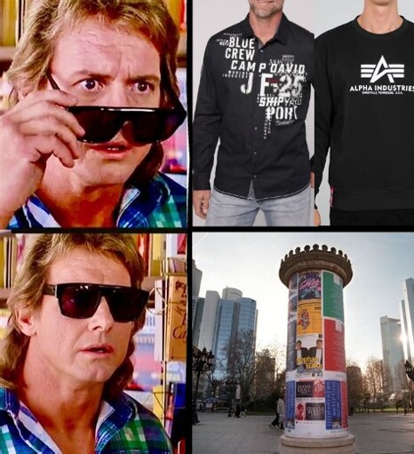 Ich sehe auf Litfaßsäulen meist nur Kulturhinweise. Das Äquivalent zu Klamottenmarken-T-Hemden wären also eher andere, weitaus kommerziellere Werbeplakate.