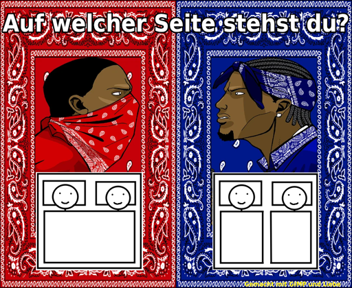 Es sind zwei Personen dargestellt, welche sich gegenüber stehen und mit unterschiedlicher Bandenkleidung dargestellt werden.