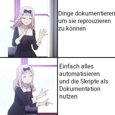 Keine Sorge, ich dokumentiere den Rest meiner Infrastruktur natürlich, aber ich will halt einfach nicht die einzelnen Installationsprozesse dokumentieren. Also einfach die Installationsskripte selber mit nen bisschen Kommentaren versehen und irgendwo vermerken, wie man die nutzen muss.