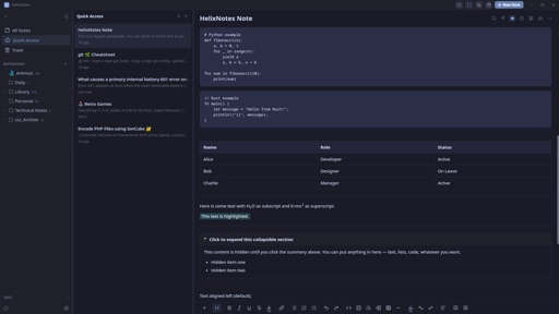 - Sync conflicts - fair point. HelixNotes watches the filesystem for external changes, but conflict resolution when two devices edit the same note is a real problem with any file-based sync. Syncthing handles this better than most (it creates conflict copies instead of overwriting), but it’s not perfect.