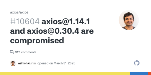arrow-up1226arrow-down1external-linkAxios JavaScript library has been compromised with malware in supply chain attackgithub.comqaz@lemmy.world to Selfhosted@lemmy.worldEnglish · 7 days agomessage-square12linkfedilink