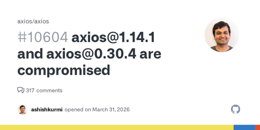 more details: https://www.stepsecurity.io/blog/axios-compromised-on-npm-malicious-versions-drop-remote-access-trojan Most likely, a maintainer's GitHub and npm accounts are compromised as these iss...