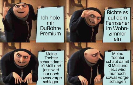 Ich habe extra ein Kinderkonto eingerichtet, aber da gibt es ja die gewünschten Videos nicht. Dann kommt meine Frau mit wenig Bewusstsein für KI und schaut das dann mit unserer Tochter an. Da rede ich auch gegen Wände. Traurig aber wahr.