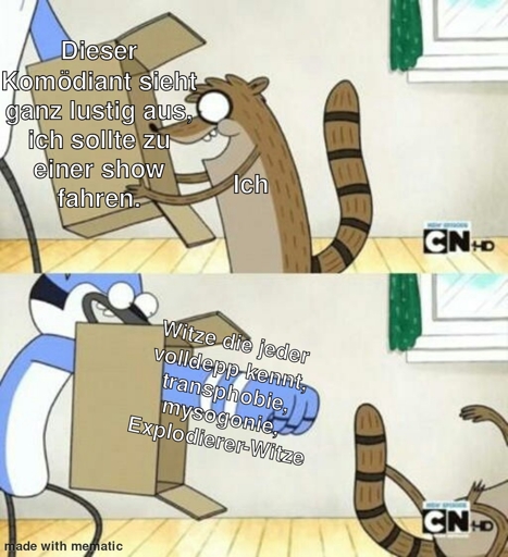 War gestern bei Nikita Miller mit einem Kumpel und das war eine derbe Enttäuschung. Ich kannte diverse clips aus dem Internet und da sah der ganz gut aus, aber das täuscht. Der bringt Witze, die mittlerweile eigentlich jeder Depp mindestens 5 mal gehört hat, 50% der Show bestanden aus Explodierer Witzen auf dem Niveau “Höhöhö, Frauen”. Außerdem muss ich mir nicht von irgendwelchen cis-Typen erklären lassen, dass ich als Transfrau eine Frau zweiter Klasse bin. Der hat halt wirklich zwischendurch einfach nur transphobes Zeug gelabert, wo die Pointe daraus besteht, dass es transohob ist und “man das ja nicht sagen darf”.