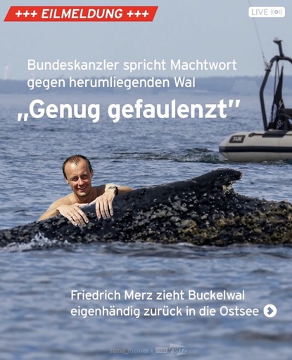 Ist nicht mal einer von einem Wal-Schwanz (nicht-hinten) durchbohrt worden als er sich einem toten, aufgeblähtem Wal genähert hat? Die Dinger explodieren wohl schonmal. Also der Wal. Bitte gehen Sie den Wal streicheln Herr Merz ʕ◕ᴥ◕ʔ