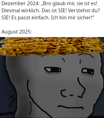 Das crazy dass du das hier postest. War mir nicht sicher ob das auf so na Meta Ebene nen shitpost ist, copypasta oder so und das “dies ist kein meme” nur ironie. Völlig falscher ort für sowas. Zu hohes Risiko witzantworten zu bekommen weil das halt ne meme community ist…